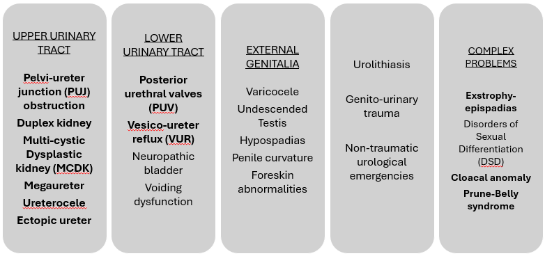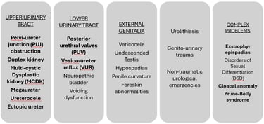 The term CAKUT was introduced at a time when doctors believed that a single genetic mechanism caused all the malformations [2]. For day-to-day paediatric urology practice, a precise anatomical diagnosis is more helpful in patient management. The spectrum of paediatric urology conditions is shown below, with CAKUT conditions highlighted in bold.